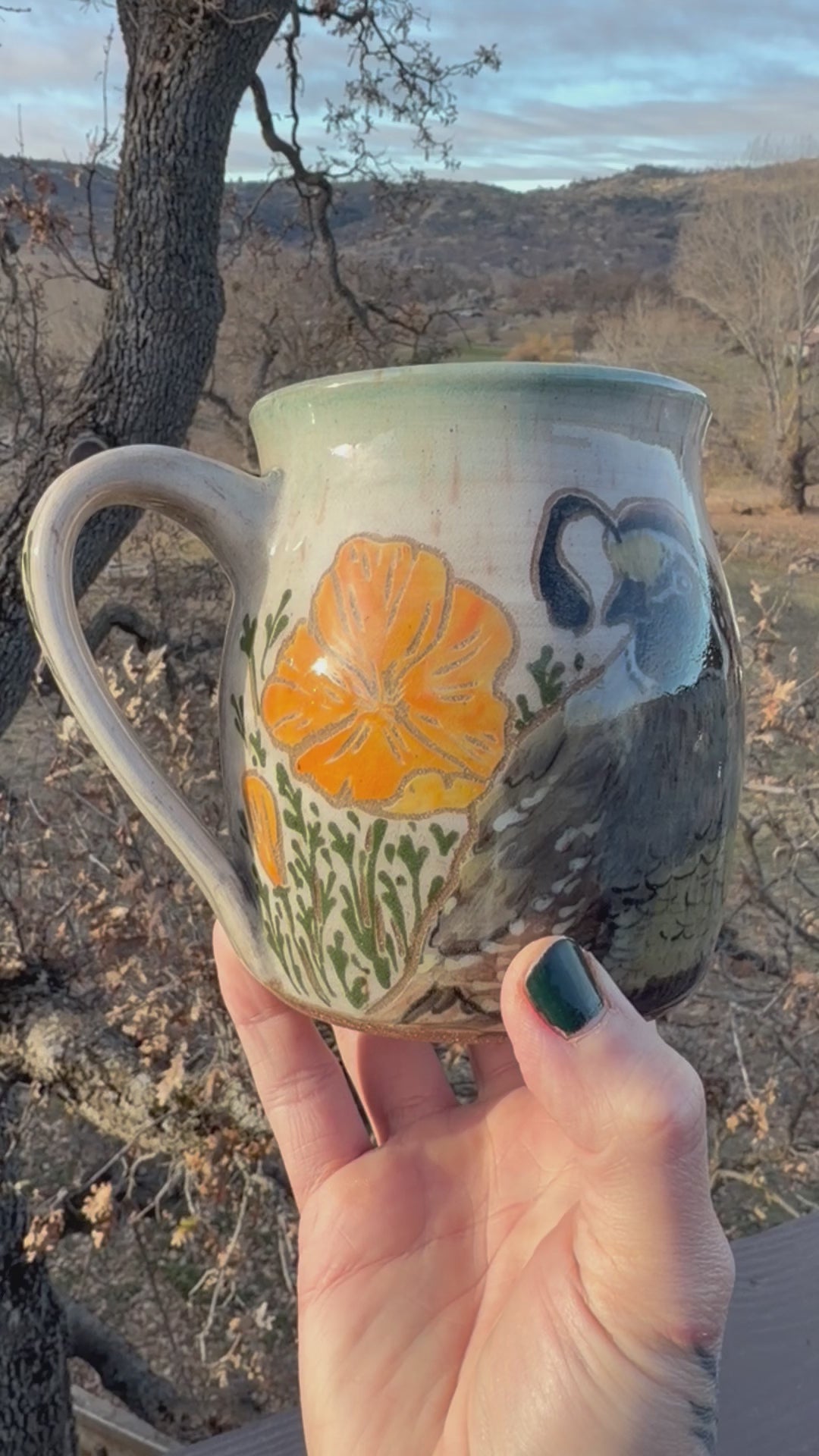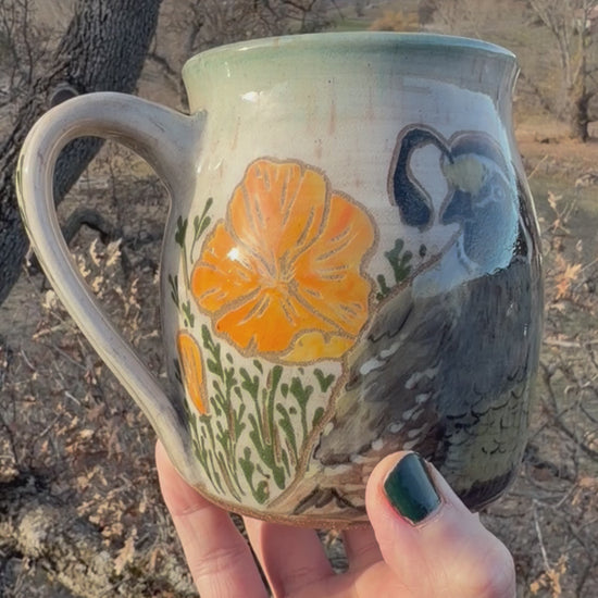 Add a touch of Californian charm to your table with our beautifully hand painted stoneware featuring the state bird, the California Quail, and the iconic California Poppy. Not only is it visually stunning, but also practical as it is dishwasher safe. Perfect for everyday use or special occasions.
