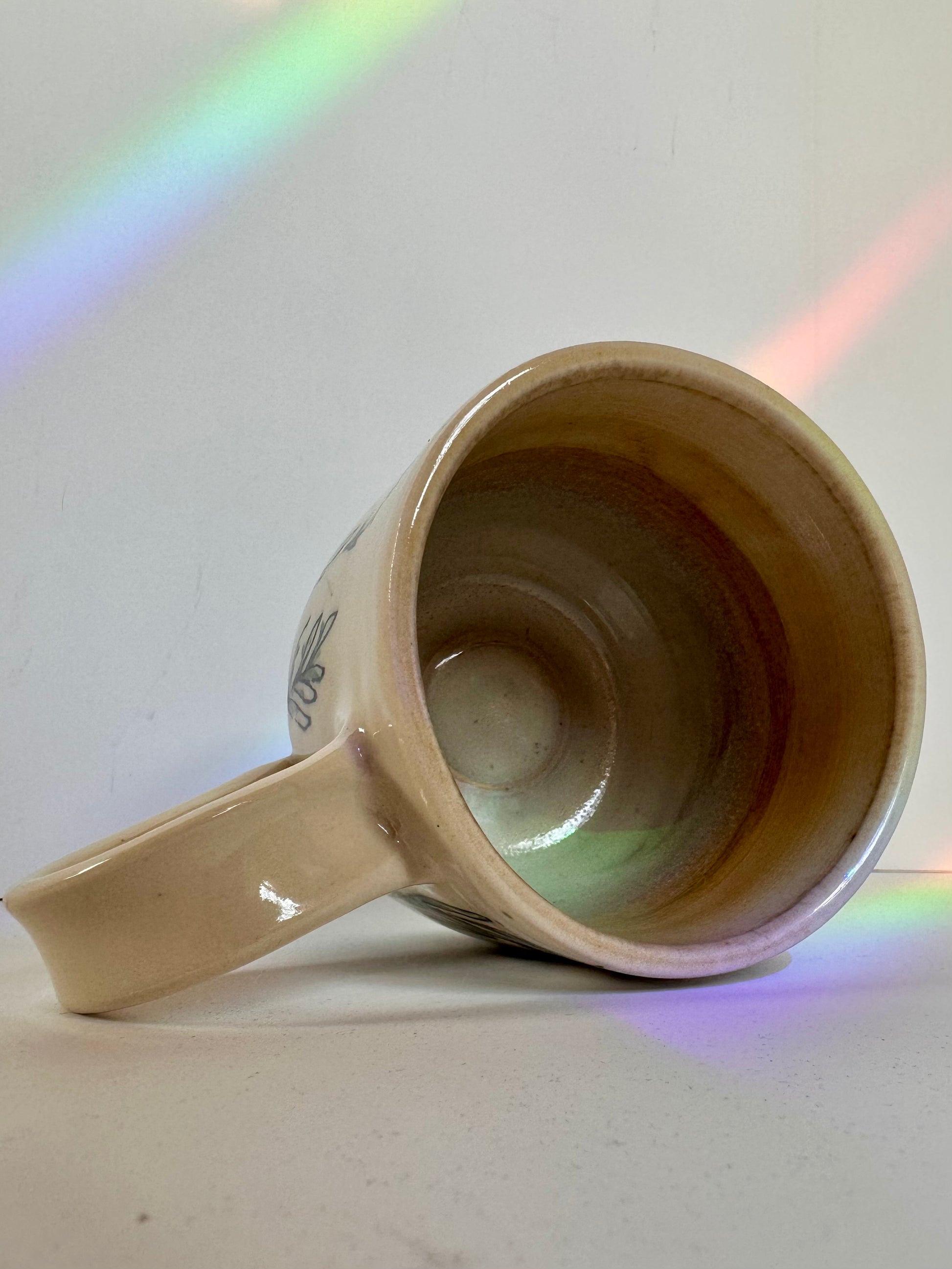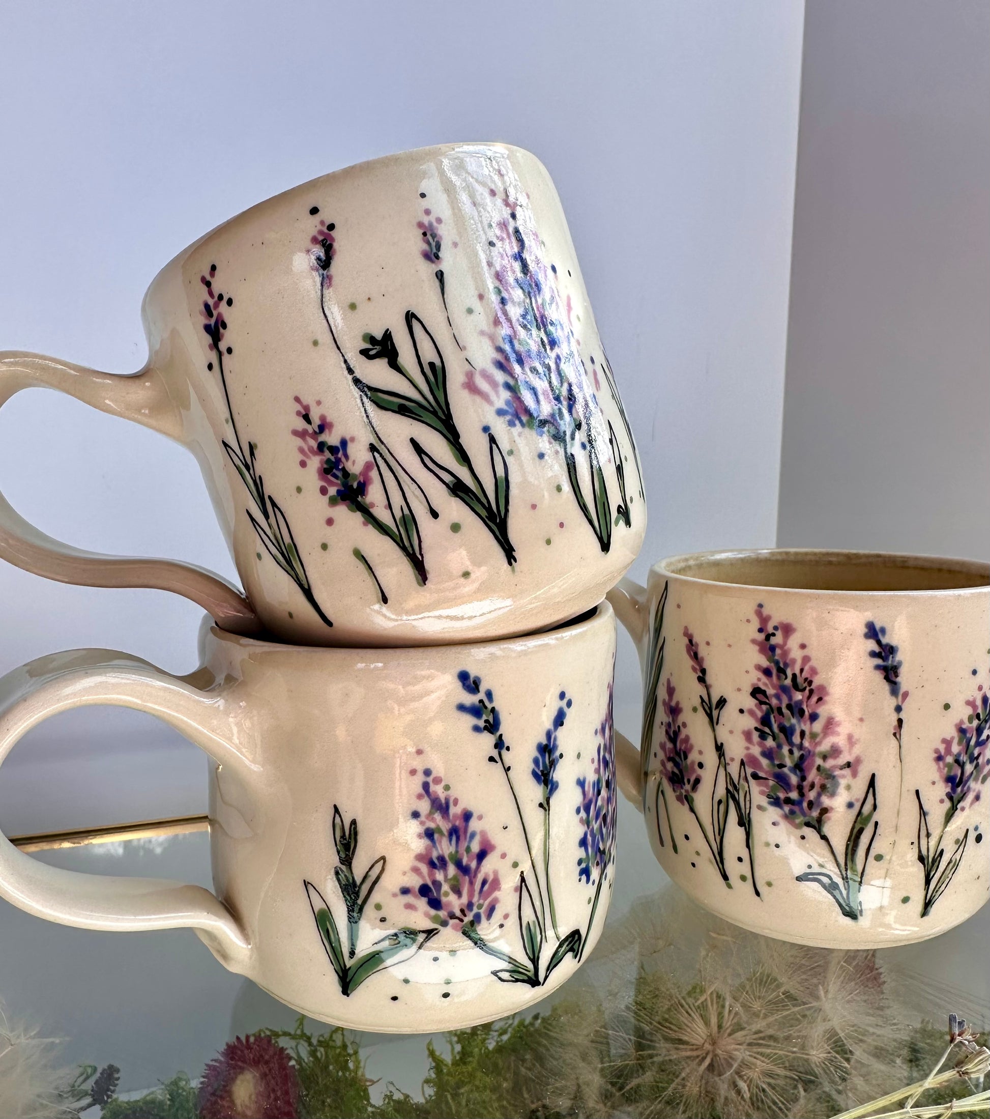 The Lavender Mug is the perfect addition to your morning routine. Handmade and hand painted, this 16 oz ceramic mug features a calming lavender design. Enjoy your coffee or tea in style with this unique and beautiful mug.